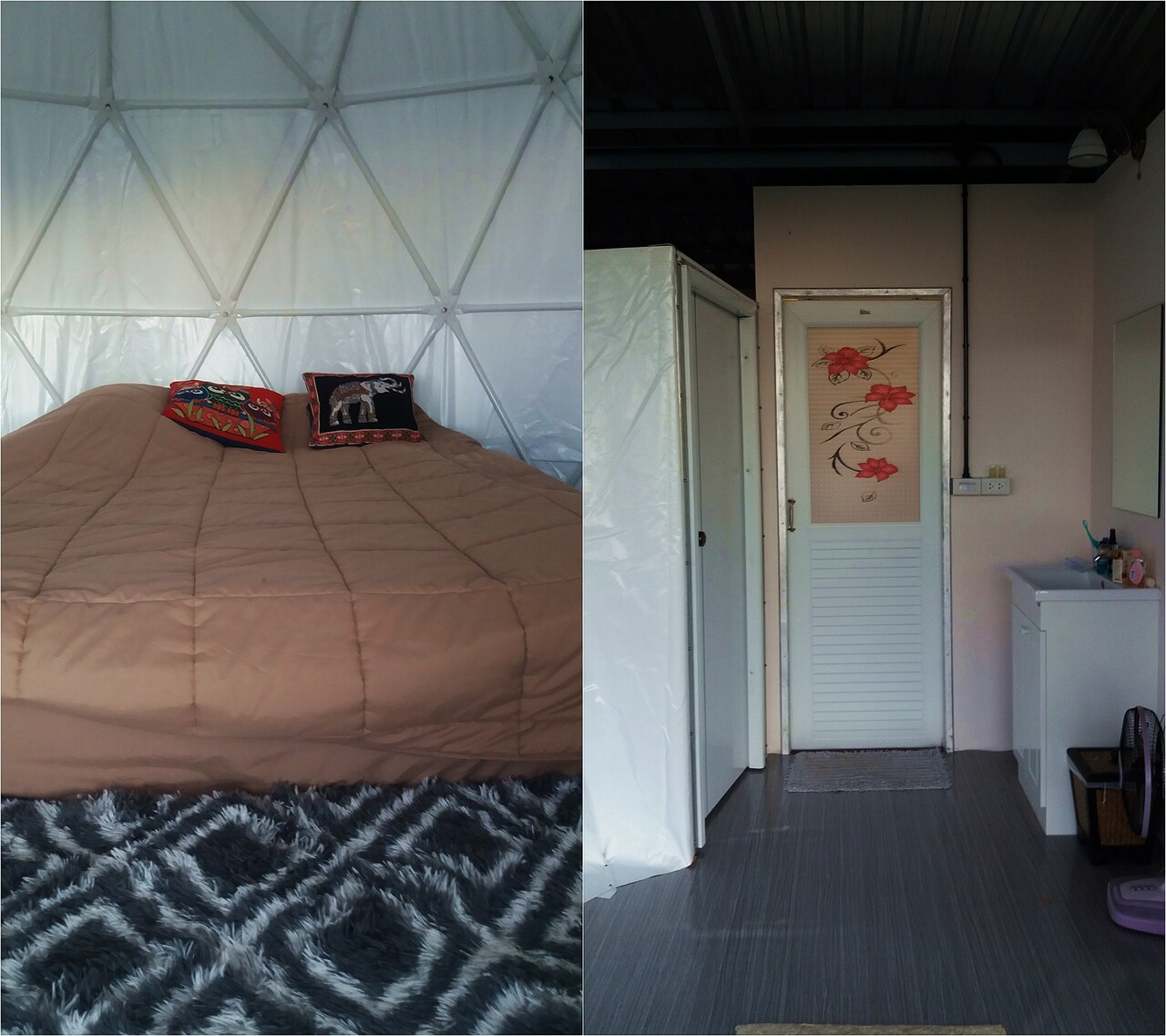 Kolejny istotny aspekt wszelkich podróży i w tym przypadku również można go odhaczyć na liście wyposażenia obiektów. W naszym przypadku łazienka znajdowała się zaraz przy wejściu do kopuły. Z kolei naprzeciwko wejścia do kopuły był też mały zlew i kosz na śmieci. Ciepła woda jest i to kolejny plus Baan Plaifha Homestay.