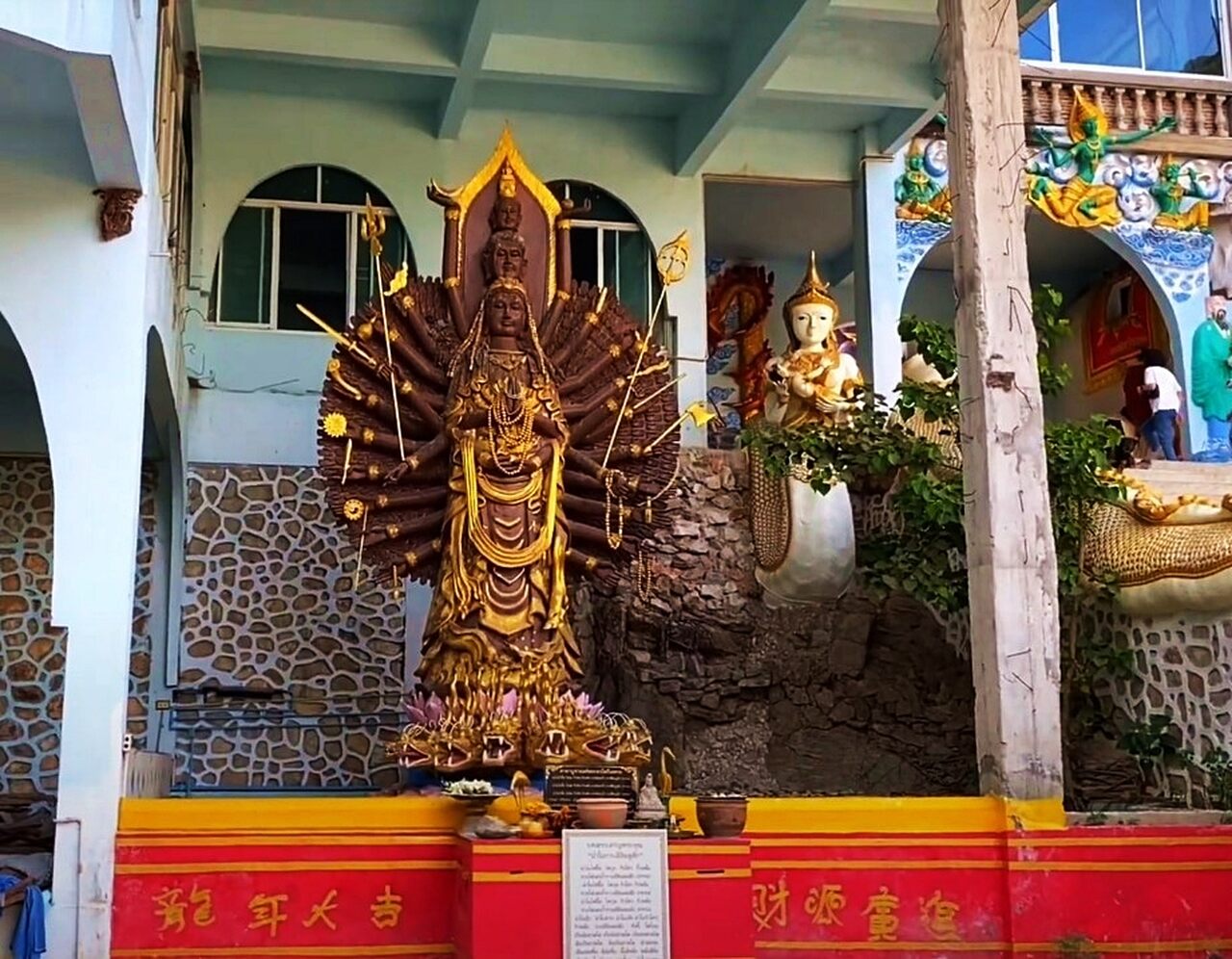 Podczas wizyty w świątyni pierwsze co przyciąga wzrok to kolorystyka. Przed wejściem jest dużo barwnych posągów przedstawiających Buddę, świętych, zwierzęta, gigantów i mityczne stworzenia zwane Nagami, które strzegą świątyni. Jest też piękna statua Guan Yin o tysiącu rąk – to chińska bogini miłosierdzia.